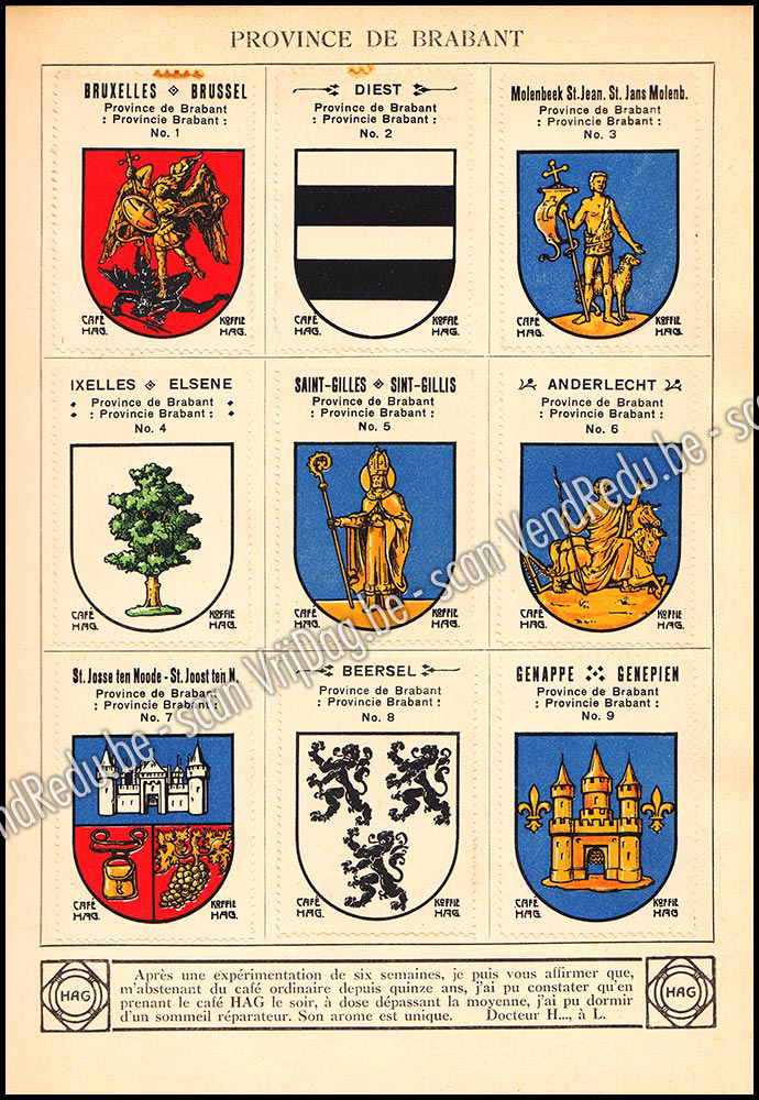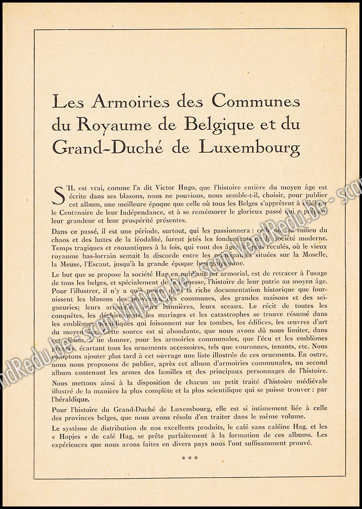 - L'Armorial du Royaume de Belgique et du Grand-Duché de Luxembourg est une œuvre emblématique de l'héraldique européenne, principalement connue à travers les célèbres albums publiés par la société Café Hag dans les années 1930.Cette collection unique se présente sous la forme de recueils de vignettes illustrées, destinées à être collectionnées et collées. Elle offre un panorama complet des blasons des communes et des provinces des deux pays, répartis en plusieurs tomes. Le premier volume se concentre sur les provinces de l'ouest et du centre de la Belgique (Anvers, Brabant, Flandres), tandis que les suivants couvrent le sud et l'est (Hainaut, Liège, Limbourg, Namur), pour finir par la province de Luxembourg et le Grand-Duché lui-même.Au-delà de son aspect ludique, cet armorial constitue une référence historique précieuse. Chaque illustration, souvent réalisée par des artistes héraldistes renommés, est accompagnée d'un blasonnement précis — la description technique en termes d'armoiries — et de notes historiques sur l'origine des localités. On y retrouve les symboles fondateurs de ces régions, comme le Lion d'or sur fond de sable pour la Belgique et le Lion rouge couronné sur son champ rayé d'argent et d'azur pour le Luxembourg.- T. I-II-III en 1 volume, les vignettes ne sont pas complètes !!!