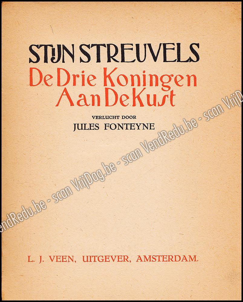 - Colophon: Deze uitgave van ‘De Drie Koningen aan de kust’ werd gezet uit de Garamond type Corps 16 op de pers van den Eikelaar ter kunstwerkstede de gebroeders De Coene te Kortrijk – verzorgd door den meester drukker Lins en voltooid in de maand December van ’t jaar 1927 – De oplage bestaat uit twintig ex. op getint Vergé Van Gelder genummerd van 1 tot 20 – vijftig ex. op Pannekoek “Antique” genummerd van 21 tot 70 – Vijftig ex. op Velijn Van Gelder genummerd van 71 tot 120 – tweehonderd ex. op Velijn Pannekoek genummerd van 121 tot 320 – Duizend ex. op getint Editie-papier.- Eerste druk gelijktijdig verschenen in Antwerpen bij L. Opdebeek en bij L. J. Veen, uitgever, Amsterdam.