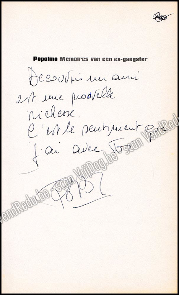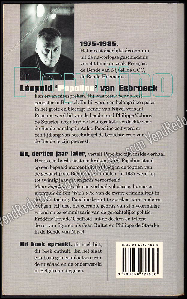 - Gesigneerd door de auteur en met opdracht (16 woorden).- 1975-1985. Het meest dodelijke decennium uit de na-oorlogse geschiedenis van dit land: de zaak-François, de Bende van Nijvel, de CCC, de Bende-Haemers...- Léopold 'Popolino' Van Esbroeck kan ervan meespreken. Hij was toen voor de kost gangster in Brussel. En hij werd een belangrijke speler in het grote en bloedige Bende van Nijvel-verhaal. Popolino werd lid van de bende rond Philippe 'Johnny' de Staerke, nog altijd de belangrijkste verdachte voor de Bende-aanslag in Aalst. Popolino zelf werd er een tijdlang van beschuldigd de beruchte reus van de Bende te zijn geweest.- Nu, dertien jaar later, vertelt Popolino zijn inside-verhaal.Het is een harde noot om kraken, want Popolino stond op een bepaald moment uiterst hoog in de toptien van de gevaarlijkste Belgische criminelen. In 1987 werd hij tot twintig jaar gevangenis veroordeeld. Maar Popolino is ook een verhaal vol passie, humor en avontuur én een Who's who van de zware criminaliteit in de jaren tachtig. Popolino begint te spreken waar anderen zwijgen. Hij doet het corrupte gedrag van zijn voormalige vriend en ex-commissaris van de gerechtelijke politie, Frédéric 'Freddo' Godfroid, uit de doeken en tekent de rol van figuren als Jean Bultot en Philippe de Staerke in de Bende van Nijvel.- Dit boek spreekt, dit boek bijt, dit boek onthult. En het slaat een hoop gemeenplaatsen over de misdaad en de onderwereld in België aan diggelen.