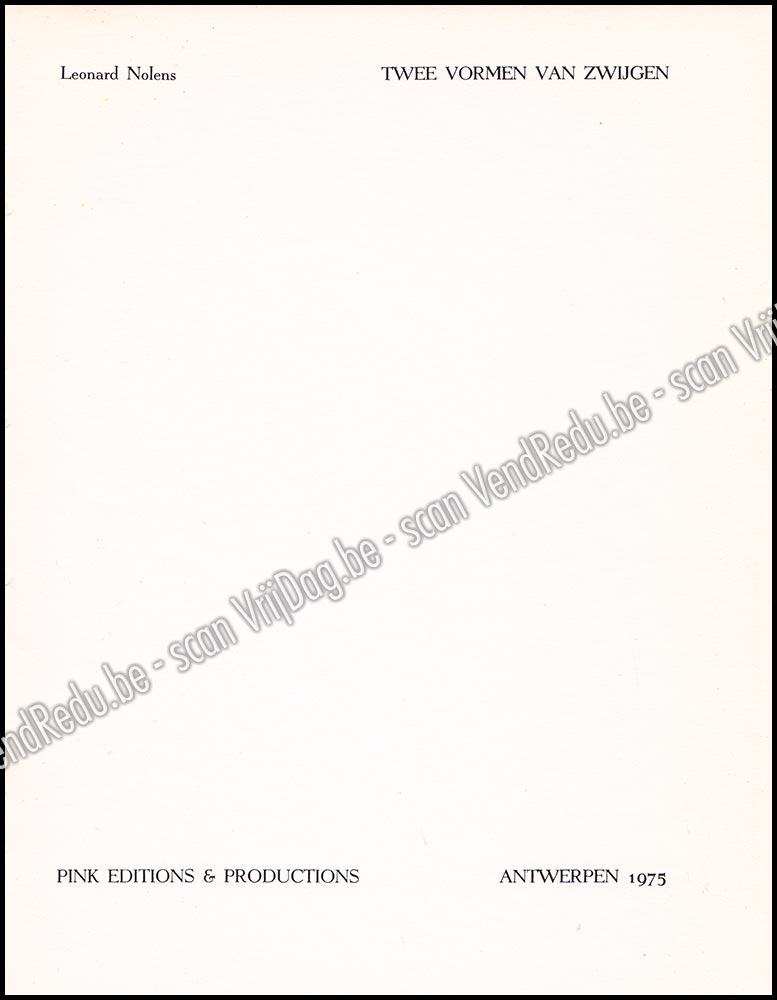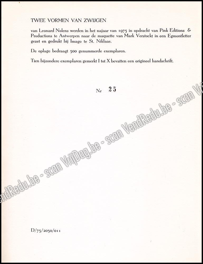 - Twee vormen van zwijgen is een poëziebundel van de Vlaamse dichter Leonard Nolens, gepubliceerd in 1975. Het is zijn derde bundel en markeert een belangrijk punt in zijn vroege oeuvre. Kenmerken van de bundelHermetisme en invloed: De gedichten in deze bundel worden vaak omschreven als hermetisch en maniëristisch. Nolens was in deze periode sterk beïnvloed door de Duitstalige dichter Paul Celan.Thematiek: Zoals de titel suggereert, staat de spanning tussen spreken en de onmogelijkheid daarvan (het "zwijgen") centraal. Nolens onderzoekt hierin de grenzen van de taal en de "onuitspreekbaarheid" van ervaringen.Overgangswerk: Literatuurhistorici zien deze bundel als het moment waarop Nolens zich begon los te maken van experimentele groepen (zoals rond het tijdschrift Labris) en een eigen, meer retorische en bezwerende stijl begon te ontwikkelen.- Bevat de cycli: Kapotgezongen en gedagtekend; Aangestorven.- Arkprijs van het Vrije Woord & Poëzieprijs van de provincie Antwerpen.- Colofon: ‘Twee vormen van zwijgen’ van Leonard Nolens werden in het najaar van 1975 in opdracht van Pink Editions en Productions te Antwerpen naar de maquette van Mark Verstockt in een Egmontletter gezet en gedrukt bij Imago te St. Niklaas.- De oplage bedraagt 500 genummerde exemplaren. Dit is nr. 25.