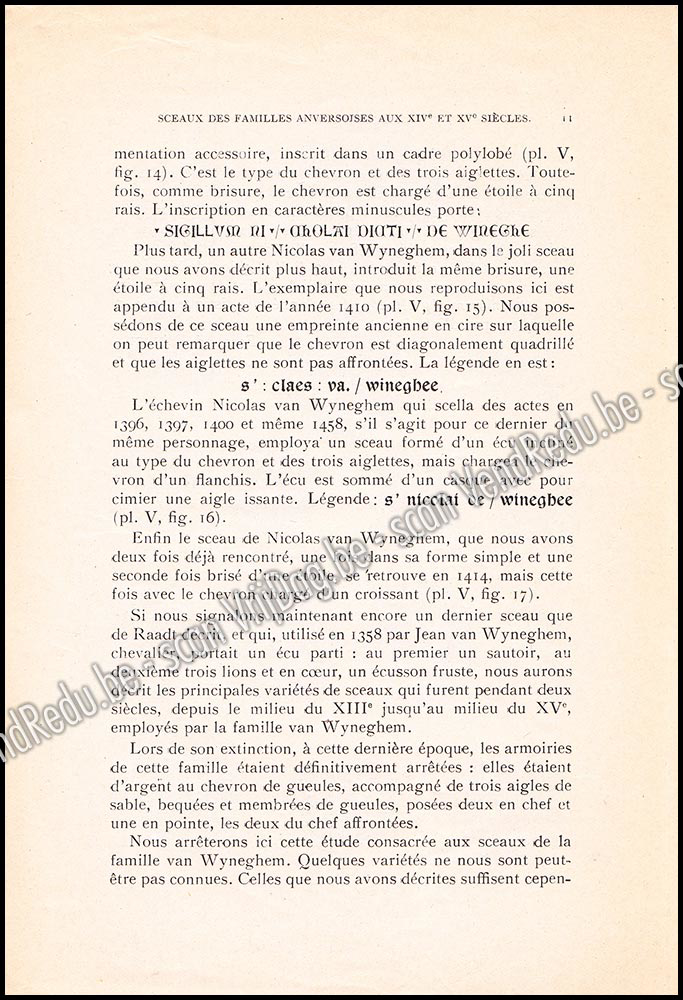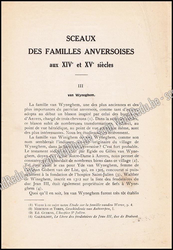 - Fernand Donnet, archiviste et historien anversois renommé (1856-1927), a effectivement étudié les sceaux des familles anversoises aux XIVe et XVe siècles de manière approfondie. La famille van Wyneghem fait spécifiquement l'objet d'une section dédiée dans ses publications.